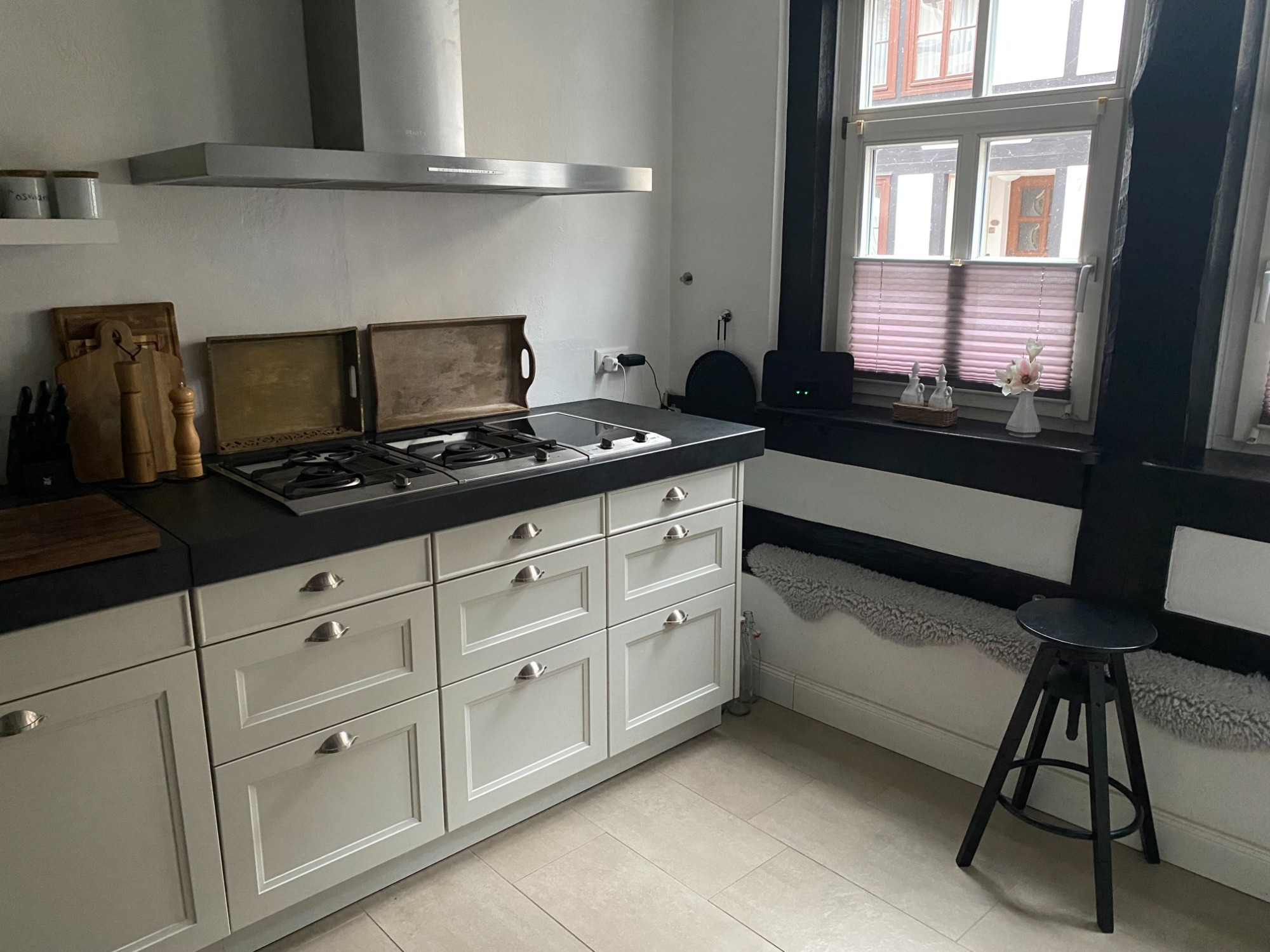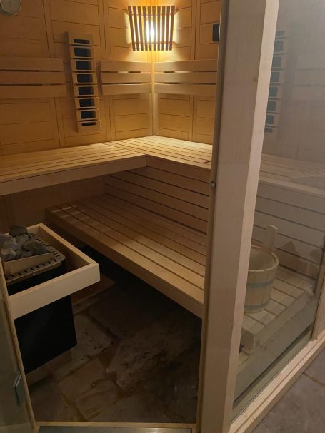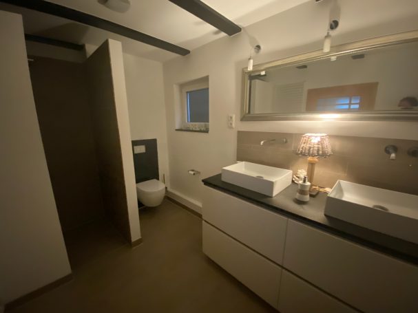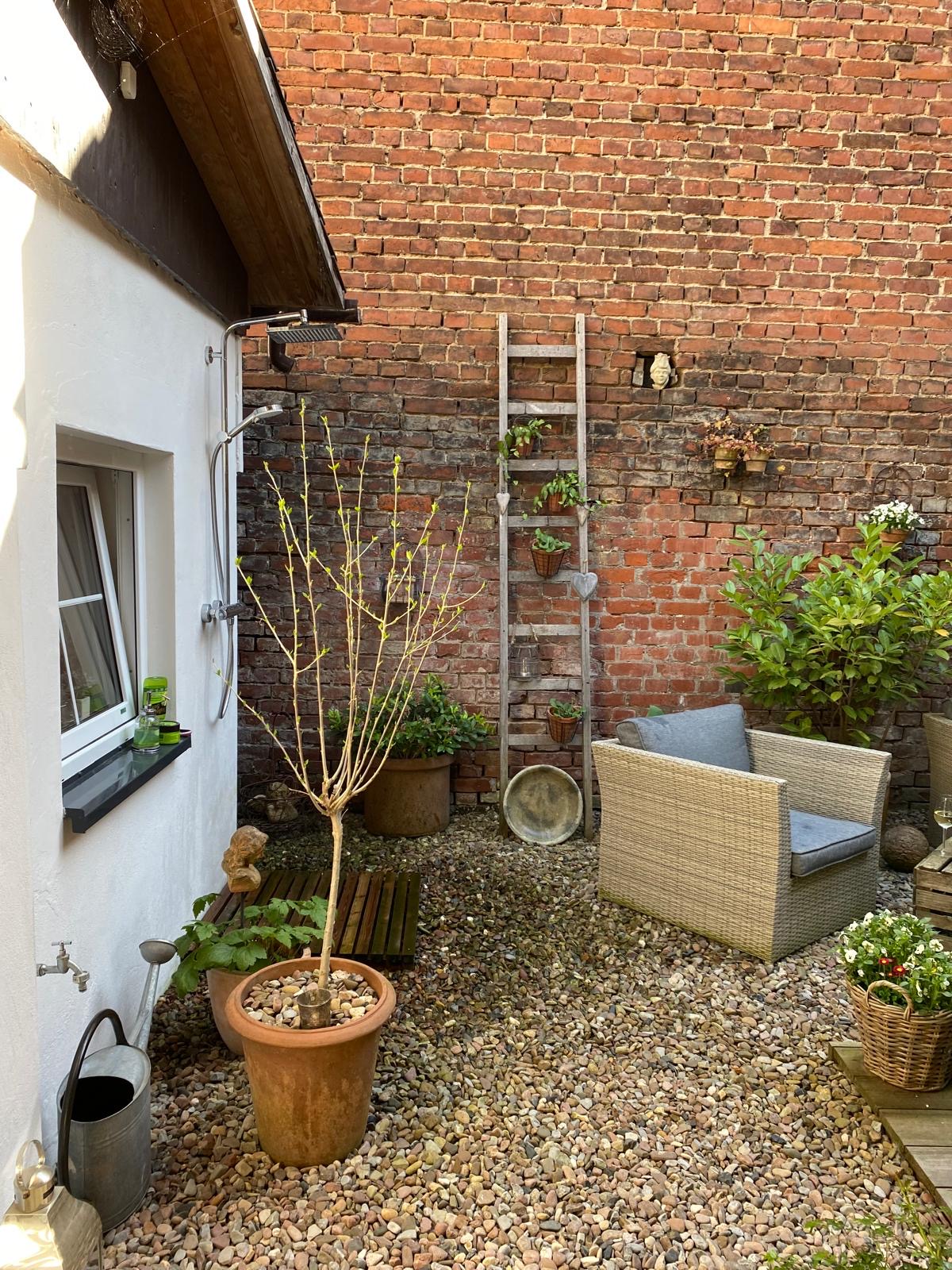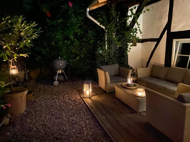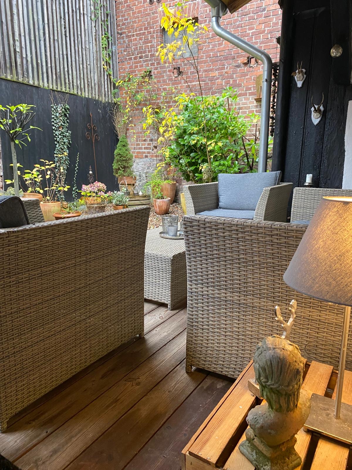Entspannen kann man am Kamin, in der Sauna (Anbau) und im gemütlichen Hinterhof mit überdachter Lounge-Sitzecke und Außendusche (nicht im Winter).